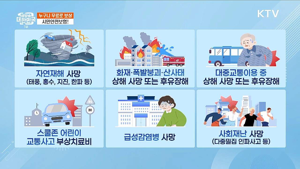 사회재난 사망, 자연재해·화재폭발 및 붕괴·대중교통 이용 중 상해 사망·후유장해, 의사상자 상해 보상금, 스쿨존 및 실버존 교통사고 상해 부상치료비 등