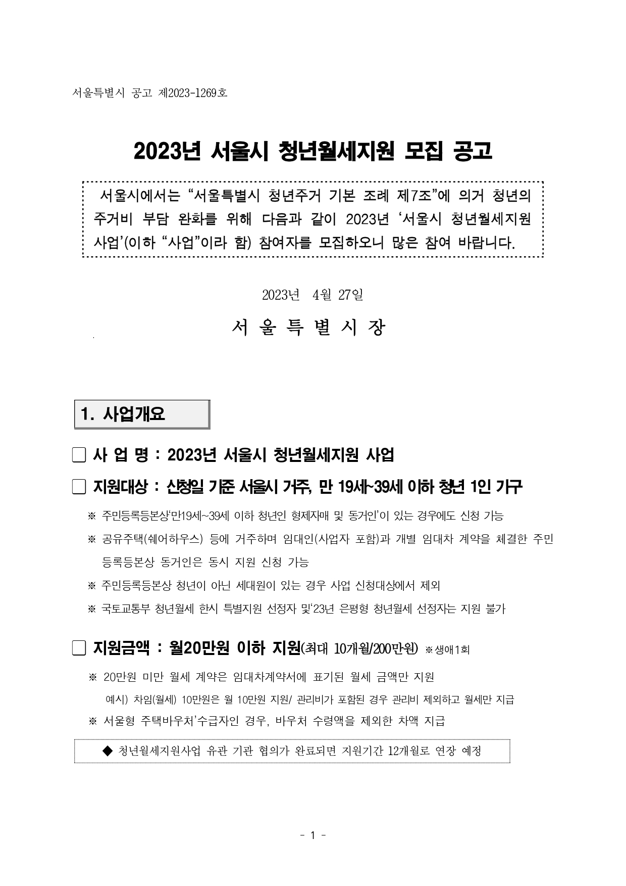 서울주거포털,서울특별시 공고 제2023-1269호 서울시에서는 “서울특별시 청년주거 기본 조례 제7조”에 의거 청년의 주거비 부담 완화를 위해 다음과 같이 2023년 ‘서울시 청년월세지원 사