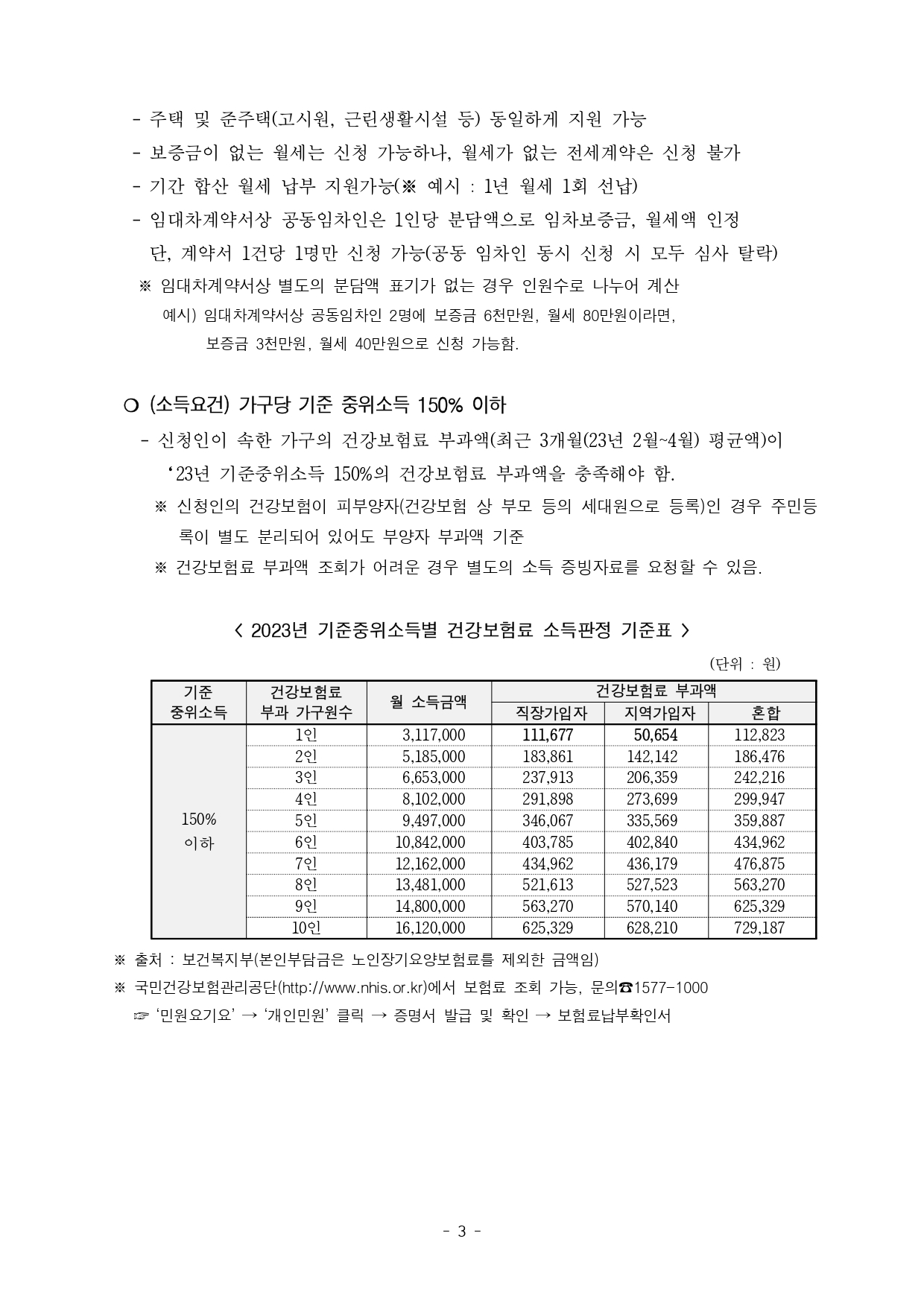 기준중위소득은 신청인이 속한 가구의 2023년 건강보험료 부과액을 기준으로 하며, 신청인의 건강보험이 피부양자(건강보험 상 부모 등의 세대원으로 소속)인 경우에는 주민등록은 분리되어 있어도 ‘부양자’의 건강보험료 부과액을 기준으로 판단한다.