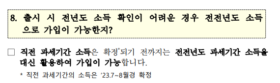 가구소득에 영향을 미치는 가구원의 경우 가입 당시 기준으로 확정, 개인 및 가구소득은 직전과세 기간인 22년 소득 확정 이전까지 전전년도 21년도 과세기간 소득 기준으로 가입 가능여부를 판단하게 된다.