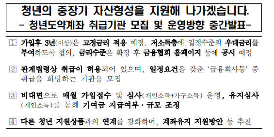 아마 본 내용이 가장 관심이 많지 않을까 생각하는데 현재 정확한 지침이 아닌 계획안이 중간보고 된 부분이라 추후 변경 가능성이 있으며, 청년희망적금 기준으로 작성된 점 유의바란다.