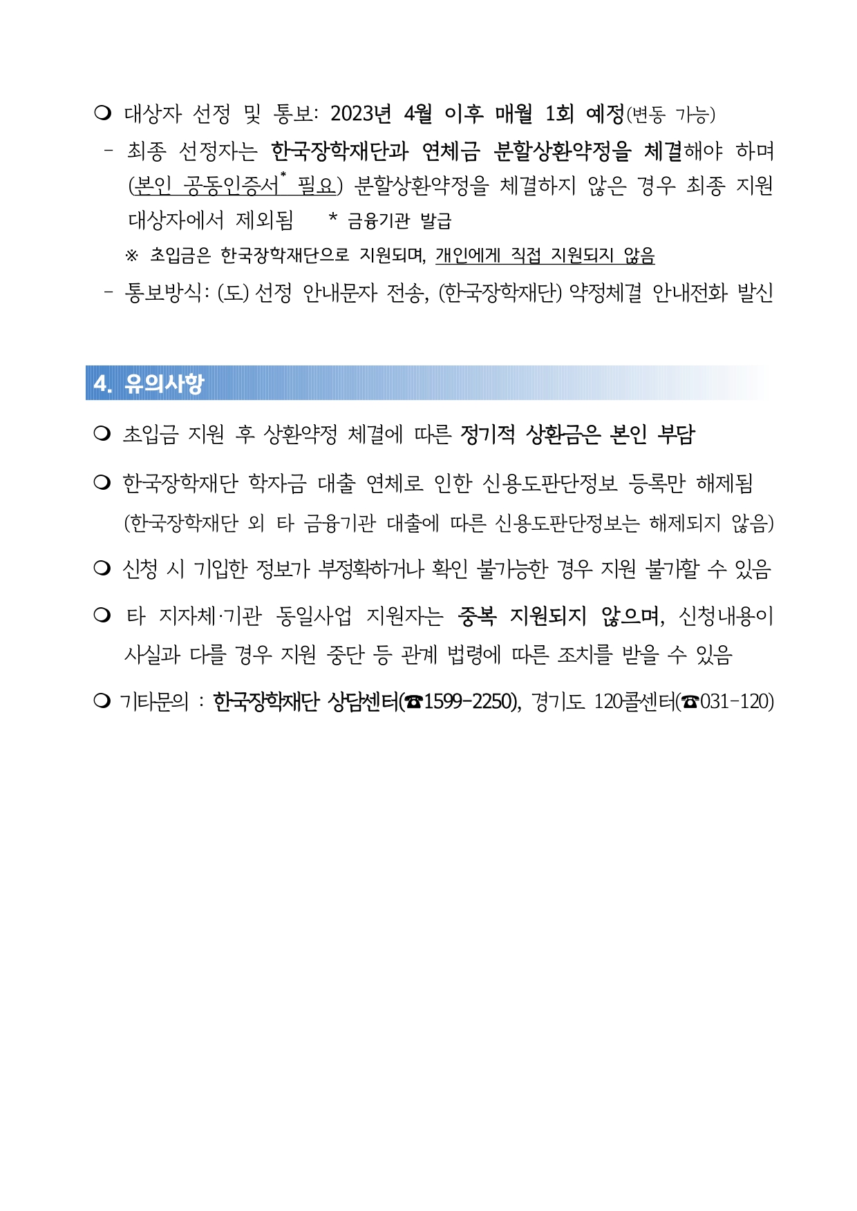 📌 최종 선정자는?한국장학재단과 연체금 분할상환약정을 체결(본인 공동인증서 필요)해야 하며, 분할상환약정을 체결하지 않은 경우 최종 지원 대상자에서 제외됩니다.※ 초입금은 한국장학재단으로 지원되며, 개인에게 직접 지원되지 않음 📌 분할상환약정이란?원금과 이자를 합친 전체 채무금의 5% 정도를 선납하면 상환기간을 최장 20년까지 늘려주는 제도로 통상 10년 내로 약정이 이뤄지는데요. 분할상환약정을 맺게 되면 한국신용정보원 신용도 판단정보 등록 해제, 연체이자 면제, 법적 조치 유보 등 신용회복 혜택이 주어집니다.