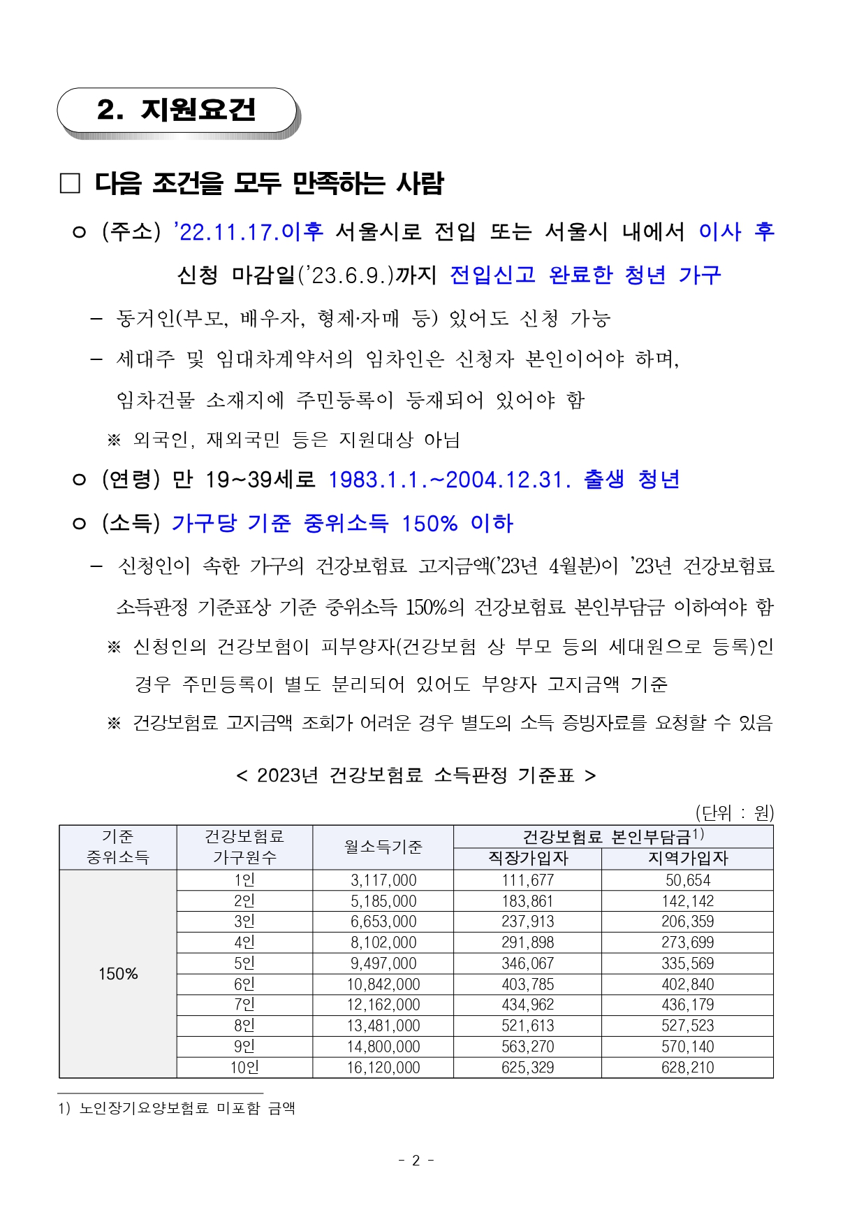 | 소득 | · 가구당 기준 중위소득 150% 이하 - 신청인이 속한 가구의 건강보험료 고지금액('23년 4월분) 기준 - 2023년 건강보험료 소득판정 기준표상 중위소득 150% 건강보험료 본인부담금 이하여야 함 - 신청인의 건강보험이 피부양자로 등록된 경우 주민등록이 별도 분리되어 있어도 부양자 고지금액 기준 |