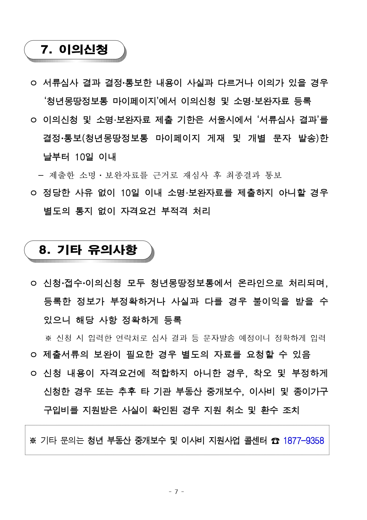 ○ 이의신청 : 2023년 7월 (예정) - 서류심사 결과를 결정·통보한 내용이 사실과 다르거나 이의가 있을 경우 '청년몽땅정보통'에서 이의신청 및 소명·보완자료 등록 - 이의신청 및 소명·보완자료 제출 기한은 서울시에서 '서류심사 결과'를 결정·통보한 날부터 10일 이내 - 정당한 사유 없이 10일 이내 소명·보완자료를 제출하지 아니할 경우 별도의 통지 없이 자격요건 부적격 처리