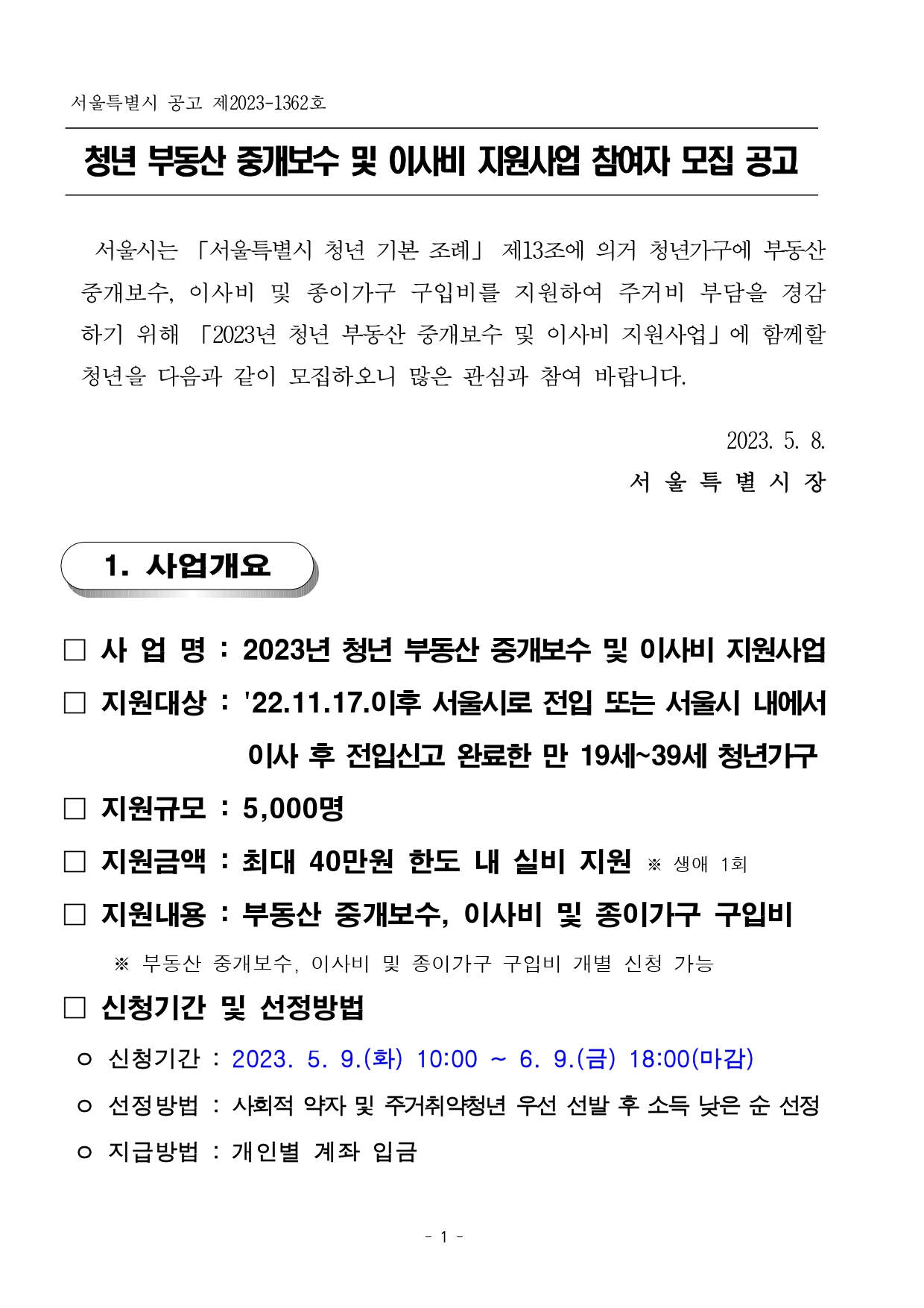 ○ 사 업 명 : 2023년 청년 부동산 중개보수 및 이사비 지원사업○ 지원대상 : 2022년 11월 17일 이후 서울시로 전입 또는 서울시 내에서 이사 후 전입신고 완료한 만 19~39세 청년가구○ 지원규모 : 5,000명○ 지원금액 : 최대 40만원 한도 내 실비 지원 ※ 생애 1회○ 지원내용 : 부동산 중개보수, 이사비 및 종이가구 구입비 ※ 개별 신청 가능○ 지급방법 : 개인별 계좌 입금○ 신청기간 : 2023. 5. 9.(화) 10:00 ~ 6. 9.(금) 18:00○ 신청방법 : '청년몽땅정보통' 온라인 신청○ 선정방법 : 사회적 약자 및 주거취약청년 우선 선발 후 소득 낮은 순 선정