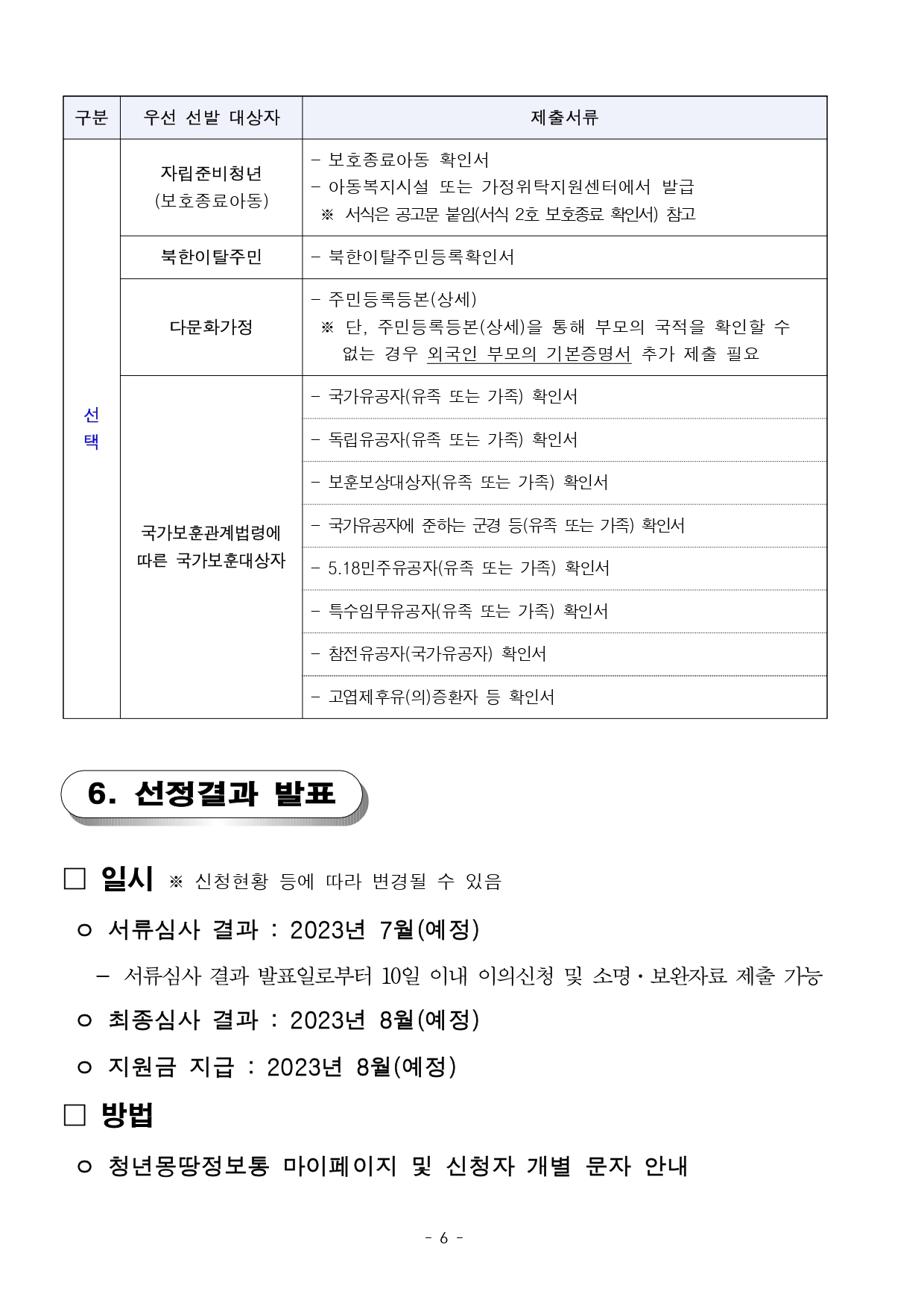 ○ 최종심사 결과 및 지원금 지급 : 2023년 8월 (예정) - 청년몽땅정보통 마이페이지에서 확인 가능 - 신청자 개별 문자 안내 예정