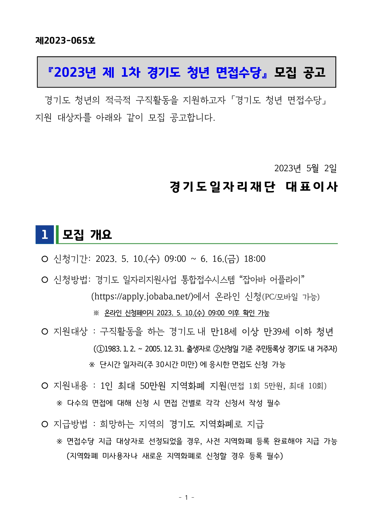 2023년 제1 차 경기도 청년 면접수당 모집 공고