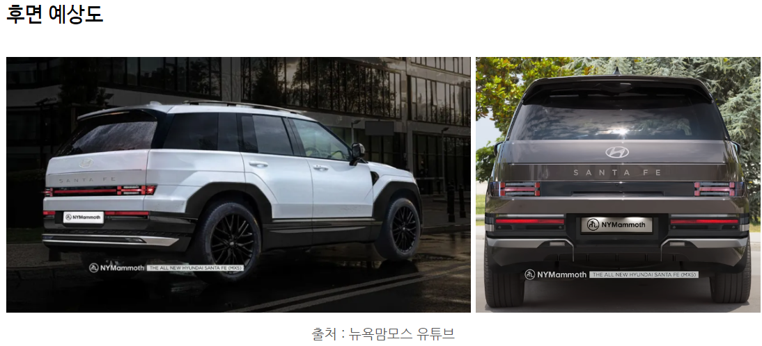 싼타페 풀체인지 MX5 예상도 후면부 역시 기존의 향수는 전혀 느낄 수 없는 완벽하게 새로운 모습을 하고 있 이 필요 없을 정도의 완벽한 변신인데요. 직각의 사격형 디자인을 전체적으로 가져가면서도 테일램프는 중간 다른 포지션을 보여주고 있습니다. 헤드램프와 마찬가지로 테일램프 역시 H를 강조하는 디테일을 보여주고 도 무게감 있는 정통 SUV의 모습을 보여주고 있습니다