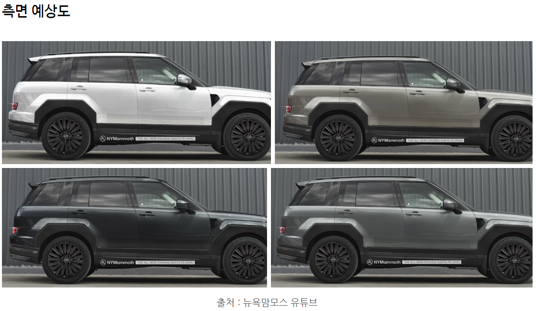 사실 제가 싼타페 풀체인지 MX5 예상도에서 가장 마음에 드는 부분은 바로 측면 디자인이라 할 수 있습니다 향기가 약간 느껴지는 듯한데요. 레인지로버, 레인지로버스포츠의 웅장하고 각진 정통 SUV의 향기가 느껴질 낌의 모습입니다. 헤드라이트에서 수직으로 떨어지는 범퍼 라인과 역시 수직으로 떨어지는 트렁크 라인과 잘 페 풀체인지를 기대하게 하는 가장 큰 요소이기도 합니다
